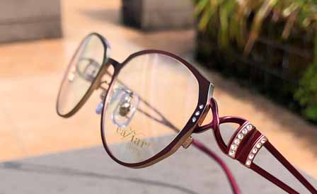 ・リボンモチーフ風のサイドにクリスタルを散りばめて、大人の女性の魅力を引き立てる、エレガントなメガネフレームに仕上がっております。