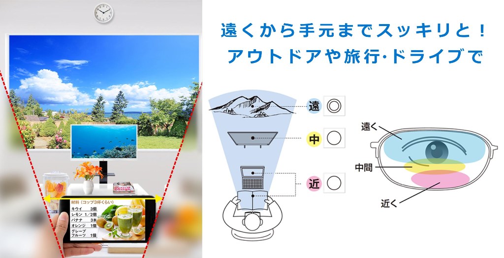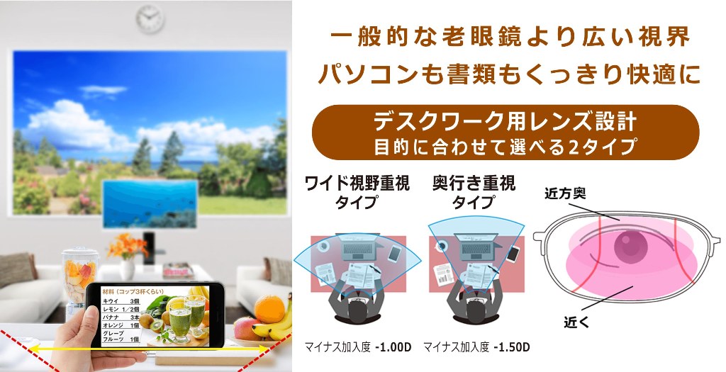 ちょっと先まで見える近用メガネレンズ。奥行き感があるからデスク周りの視界をほぼカバーします。