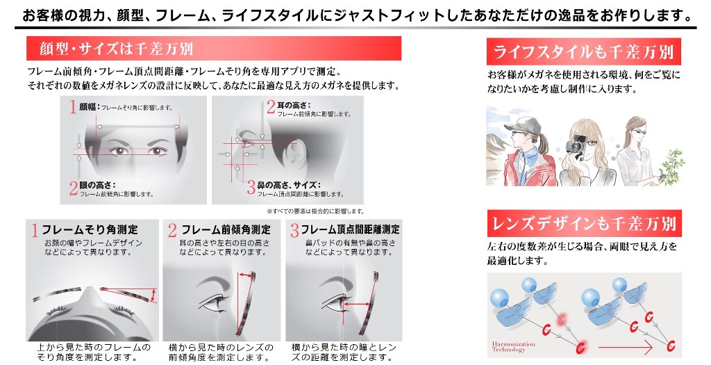 あらかじめ決められたレンズ設計とは違い、お客様の装用条件や選んだメガネフレームの形状をレンズ設計に反映して製作する個別オーダーメイドレンズです。
