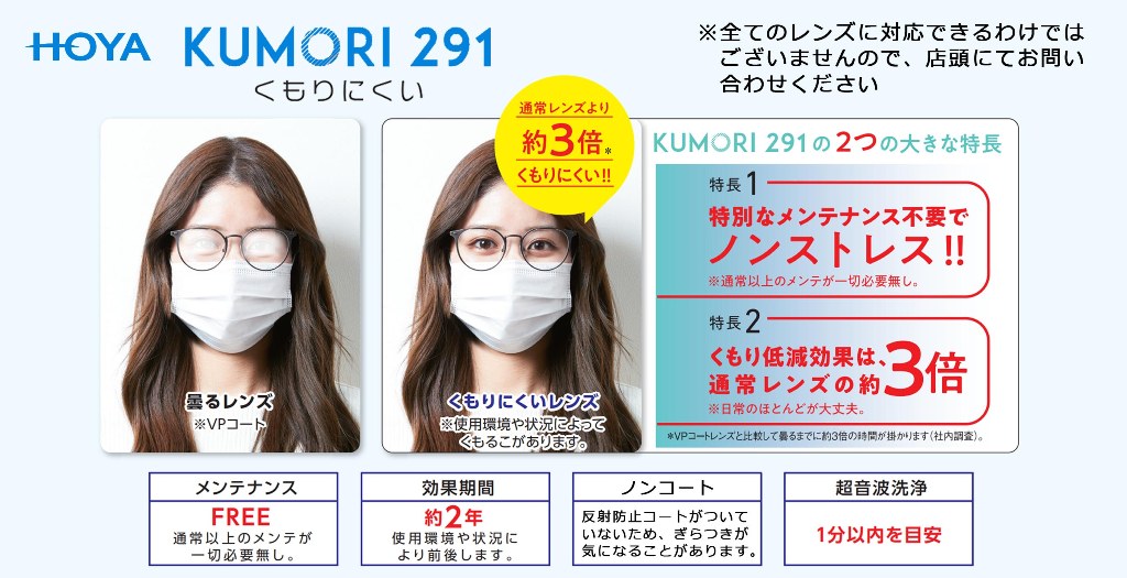 レンズ両面に吸水性の高い膜をコーティングすることにより優れたくもり低減性能を発揮します。