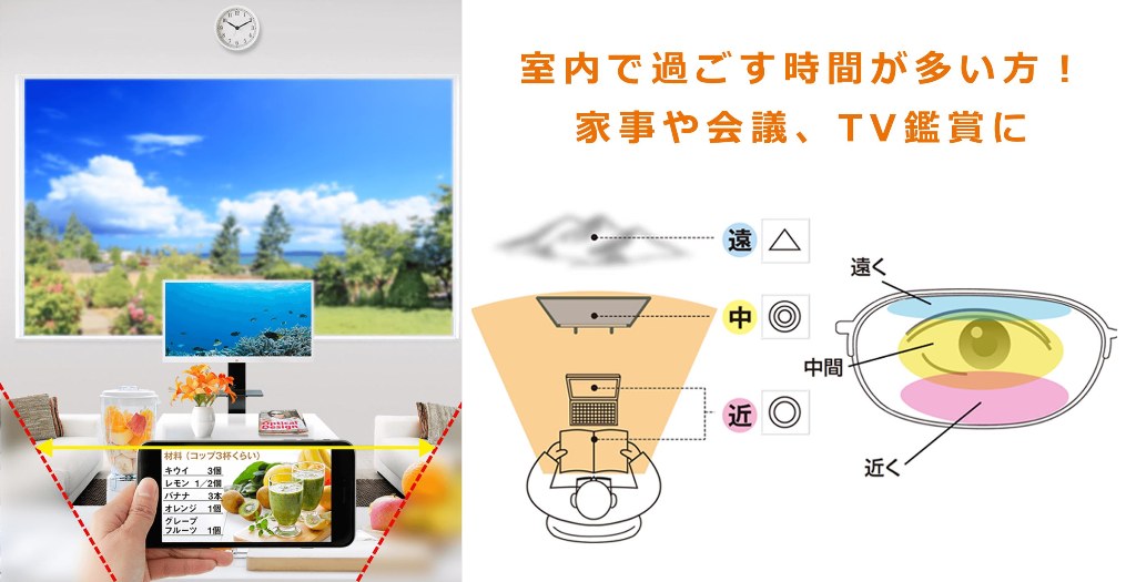遠近両用レンズよりも遠くは見えにくい分、中間距離から近距離の範囲が広くお部屋やオフィスで過ごす時間の長い方に最適です。リモートワークなど室内時間が長くなったことで中近エリアの見え方を重視する方が増えており、運転時以外の常用メガネとしておすすめです。