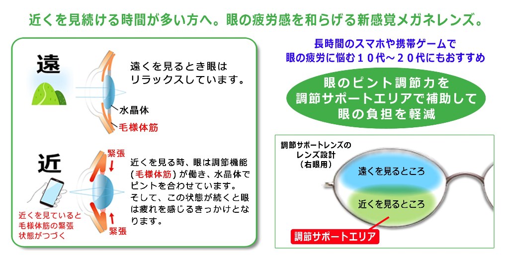 調節機能サポートレンズはレンズ下方のサポートエリアが眼の調節機能を助け、長時間の近方作業を楽にさせます。